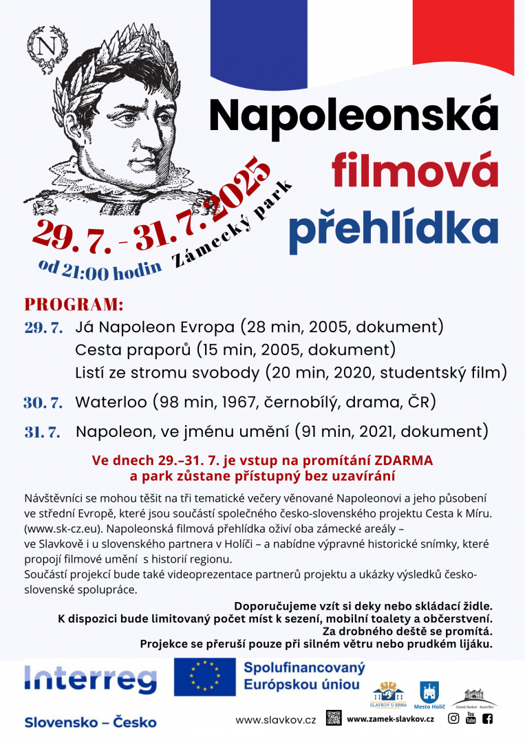Oba zámecké areály ve Slavkově a v Holíči oživí venkovní filmová přehlídka s tématem působení Napoleona v našem regionu. Během sezóny 2025 budou ve slavkovském zámeckém parku promítané 3 filmy. Součástí promítání bude také popularizace a publicita projektu prostřednictvím videoprezentace obou partnerů a výstupů projektu. Nabídka filmů se dle individuálních licenčních podmínek filmů přesune rovněž k slovenskému partnerovi.